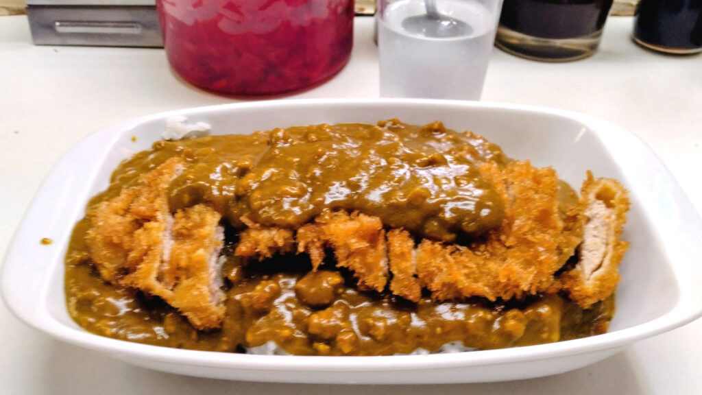 お皿の縁までたっぷりと盛られたルーの上に、カツが鎮座するボリュームのある一皿です。